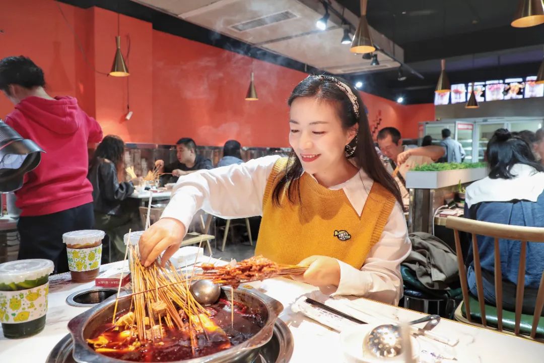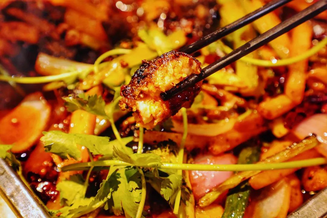 现杀活鱼肉质鲜嫩肥美,鱼肉经过高温烤制,变得十分焦香,在一番泡煮后,更是充分吸收了汤汁的麻与辣,吃起来口口生香,十分快意。黄瓜块、土豆条、藕片等蔬菜在鱼汁里“润”过之后味道更鲜辣。