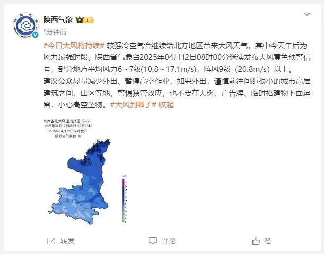 较强冷空气会继续给北方地区带来大风天气,其中今天午后为风力最强时段。陕西省气象台2025年04月12日08时00分继续发布大风黄色预警信号,部分地方平均风力6~7级(10.8~17.1m/s),阵风9级(20.8m/s)以上。