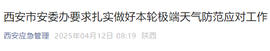 今天(4月12日)上午,西安市应急管理局发布《西安市安委办要求扎实做好本轮极端天气防范应对工作》,具体内容如下↓↓↓