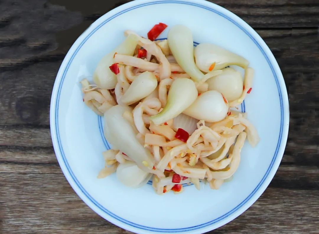 腌藠头萝卜条是遂昌乡村农家的家常小菜,无论喝粥、吃饭、喝酒,人们都喜欢有一小碗腌藠头萝卜条,开胃爽口。