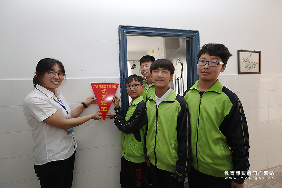 新安县产业集聚区实验学校男生宿舍,生活老师向表现良好的宿舍颁发“优秀寝室”流动红旗。(张劲松/摄 李丹/文)