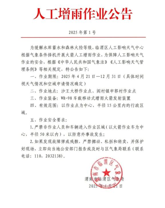 为缓解水库蓄水和森林火险等级,临渭区人工影响天气中心根据气象条件择机开展火箭人工增雨作业,为保障人工影响天气作业的安全,根据《中华人民共和国气象法》《人工影响天气管理条例》等相关规定,特公告如下: