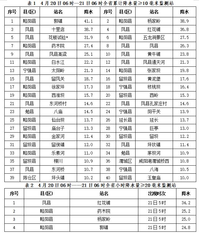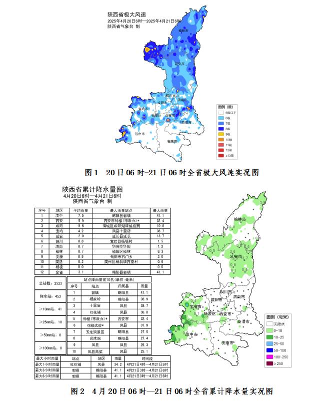昨日白天全省大部晴间多云,中北部多地出现大风,关中局地出现高温天气,夜间起陕北部分、关中西部及陕南西部等地出现雷雨天气,部分地方伴有短时暴雨、雷暴大风等强对流天气;昨日至今晨陕北部分、宝鸡西部、汉中西部及秦岭山区部分共78区县513站出现7级(13.9~17.1米/秒)及以上阵风(图1),其中宜君局地阵风风力达11级(28.5~32.6米/秒),最高华阴南峰站40.3米/秒(13级)。4月20日06时—21日06时全省共有62个区县453个监测站出现降水,最大略阳郭镇41.1毫米,其中10站大雨,31站中雨,412站小雨(图2,表1)。全省小时雨强大于等于10毫米共41站次,小时雨强大于等于20毫米共4站次,小时雨强大于等于30毫米共1站次,最大凤县红花铺4月21日5时雨强为34.2毫米(表2)。