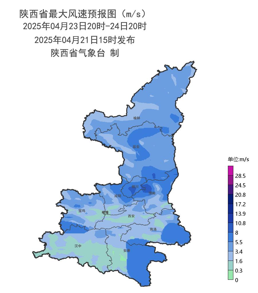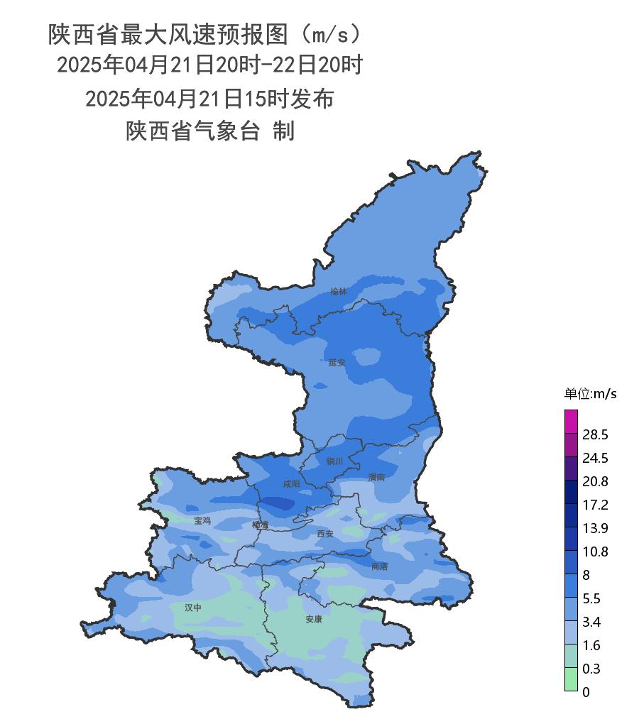 陕西省气象台2025年04月21日08时50分继续发布大风蓝色预警信号:目前陕北大部县区、关中北部部分县区、汉中西部县区已出现6-8级大风,预计下述地区未来24小时内将受大风影响,平均风力5-6级(8.0-13.8m/s),阵风7-8级(13.9-20.7m/s),局地可达9级(20.8m/s)以上:西安市新城区、碑林区、莲湖区、灞桥区、未央区、雁塔区、阎良区、临潼区、长安区、鄠邑区、高陵区、蓝田县、周至县、西咸新区,宝鸡市渭滨区、金台区、陈仓区、扶风县、眉县、岐山县、凤翔区、太白县、麟游县、千阳县、陇县、凤县,咸阳市秦都区、渭城区、兴平市、武功县、三原县、泾阳县、礼泉县、乾县、永寿县、彬州市、淳化县、旬邑县、长武县,铜川市王益区、印台区、耀州区、宜君县,渭南市临渭区、韩城市、华阴市、华州区、潼关县、大荔县、澄城县、合阳县、蒲城县、富平县、白水县,延安市宝塔区、安塞区、黄陵县、黄龙县、宜川县、洛川县、富县、甘泉县、吴起县、志丹县、子长市、延川县、延长县,榆林市榆阳区、横山区、神木市、府谷县、定边县、靖边县、绥德县、米脂县、佳县、吴堡县、清涧县、子洲县,汉中市汉台区、南郑区、城固县、洋县、勉县、西乡县、略阳县、镇巴县、宁强县、留坝县、佛坪县,安康市汉滨区、汉阴县、石泉县、宁陕县、紫阳县、镇坪县、旬阳市、白河县,商洛市商州区、洛南县、丹凤县、商南县、山阳县、镇安县、柞水县,杨凌示范区杨陵区。另外陕北西北部伴有扬沙或浮尘天气。请注意防范。