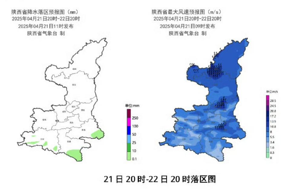 04月22日20时-04月23日20时:全省多云间晴天,安康南部局地有分散性小雨或阵雨(0-2mm)。陕北、关中北部、秦岭山区有4级左右(5.5~10.7m/s)偏北风,阵风6-7级(10.8~17.1m/s)。陕北西部局地有霜冻。