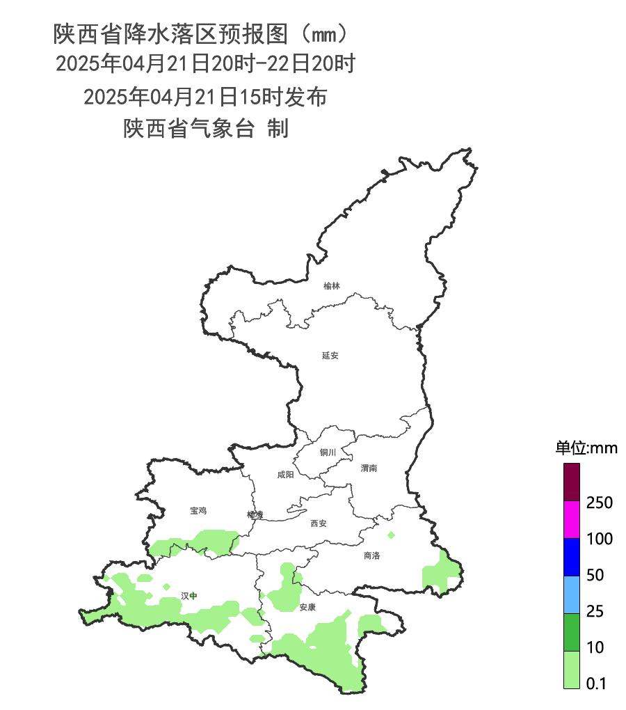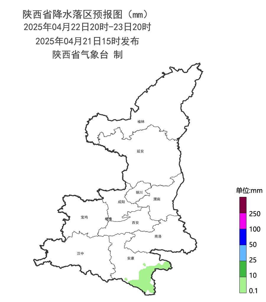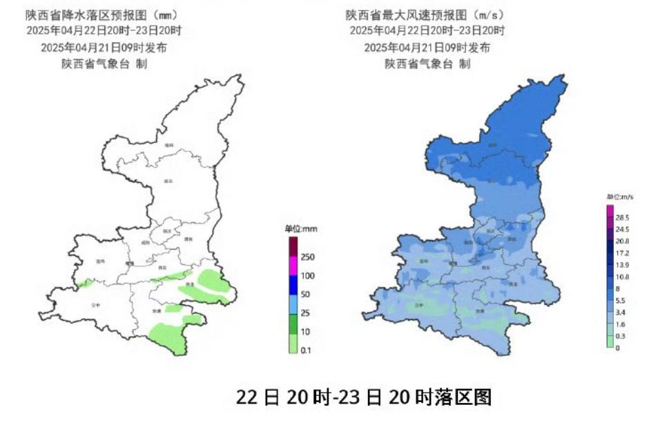 4月22日20时-4月23日20时:全省多云间晴天,秦岭山区、商洛、安康局地有分散性小雨或阵雨(0-3mm)。陕北、关中北部、秦岭山区有4级左右偏北风,阵风6-7级。陕北西部局地有霜冻。