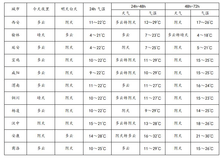04月23日20时-04月24日20时:陕北北部多云间晴天,陕北南部、关中、陕南多云转阴天。陕南南部有分散性小雨或阵雨(0-2mm)。陕北南部、关中北部、陕南东部、秦巴山区西段有4级左右(5.5~10.7m/s)偏北风,阵风6-7级(10.8~17.1m/s)。陕北西部局地有霜冻。