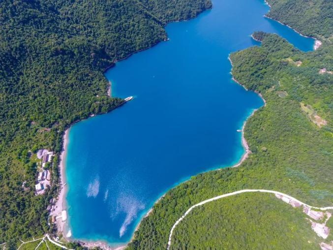 环湖步道在树荫中影影绰绰