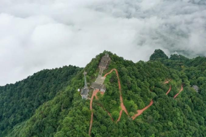 山顶庙宇与红日、云海互为映衬
