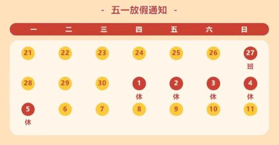 5月1日(星期四)至5日(星期一)放假,共5天。
