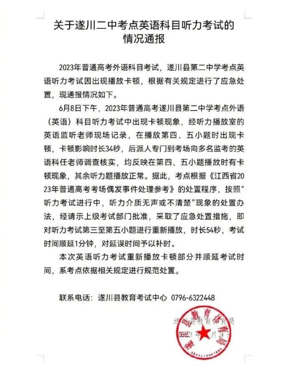 江西遂川县教育体育局昨日通报:6月8日下午,遂川县第二中学考点外语(英语)科目听力考试中出现卡顿现象,经听力播放室的英语监听老师现场记录,在播放第四、五小题时出现卡顿,卡顿影响时长34秒,后派人专门到考场向多名监考的英语科任老师调查核实,均反映在第四、五小题播放时有卡顿现象,其余听力题播放正常。据此,考点根据处置程序,对听力考试第三至第五小题进行重新播放,时长54秒,考试时间顺延1分钟,对延误时间予以补时。
