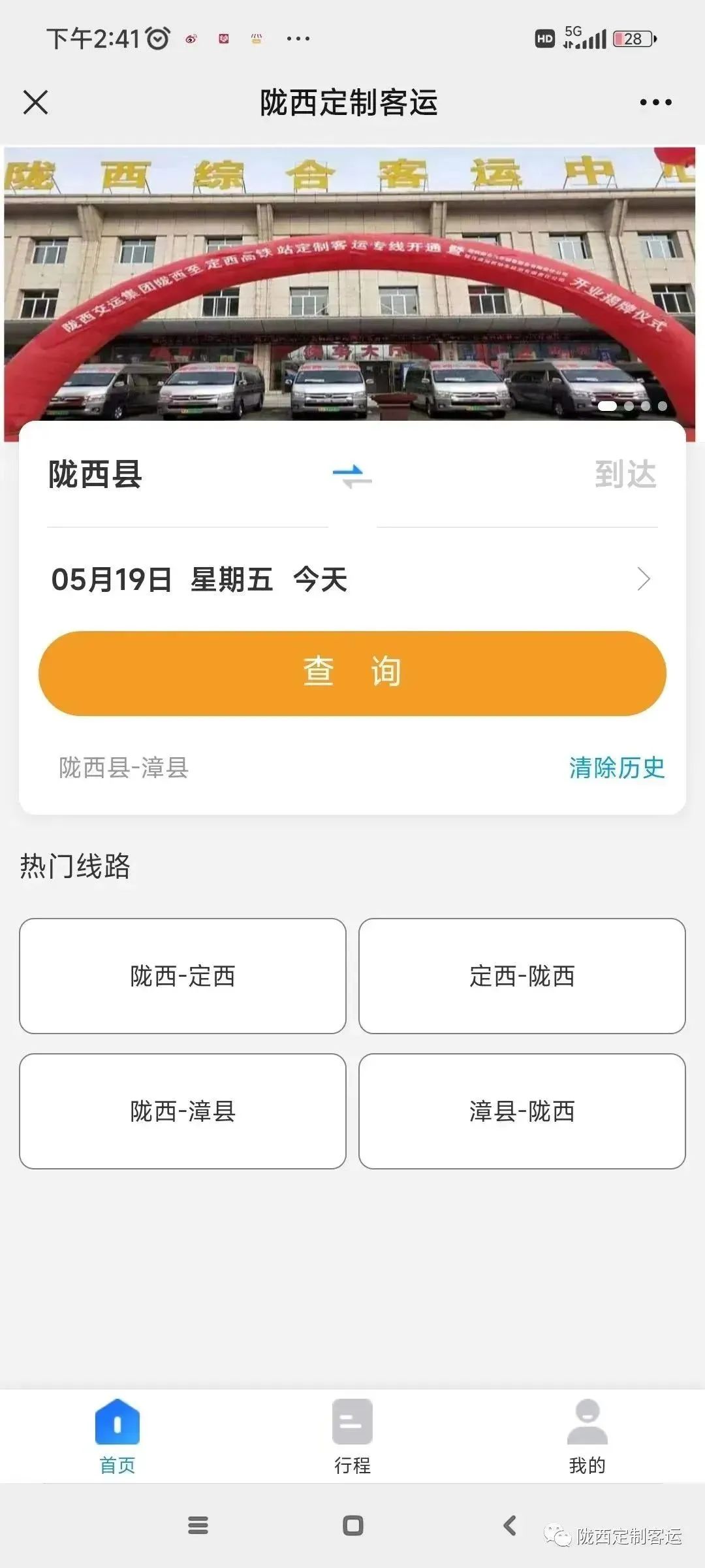 一、微信搜索陇西定制客运公众号或扫描二维码,根据出行需求选择线路(在陇西定制客运首页直接输入出发地、到达地)选择出行日期和班次。