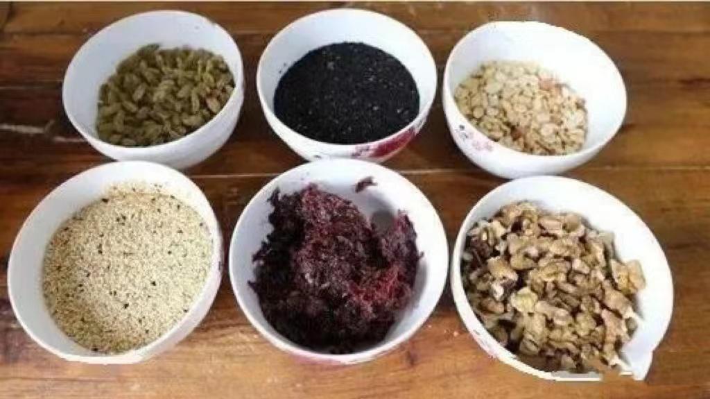 岷县点心馅里添加的原料有:绿红丝、玫瑰糖、核桃仁、花生米、冰糖、白沙糖、金桔、胡麻油油、和各种香料。