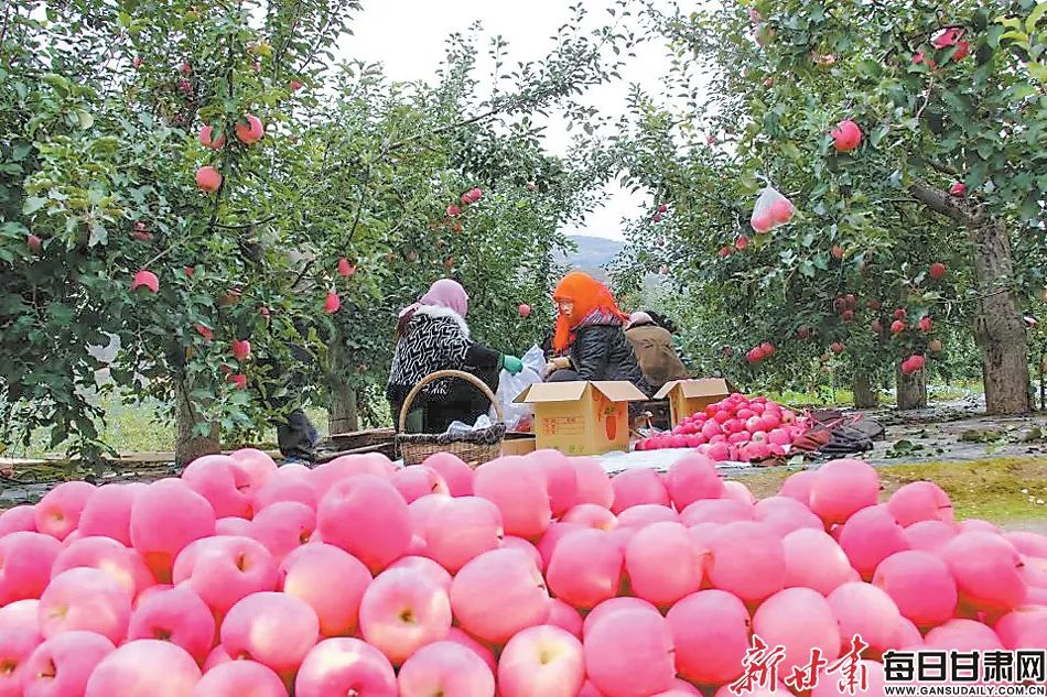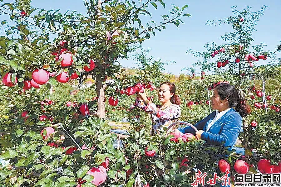 沿着泾川县南北二塬的乡村道路放眼望去,连片的果园里红彤彤的苹果挂满枝头。