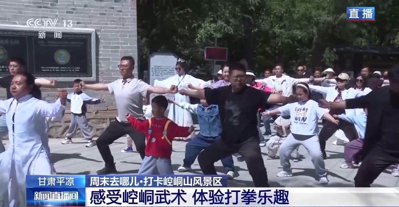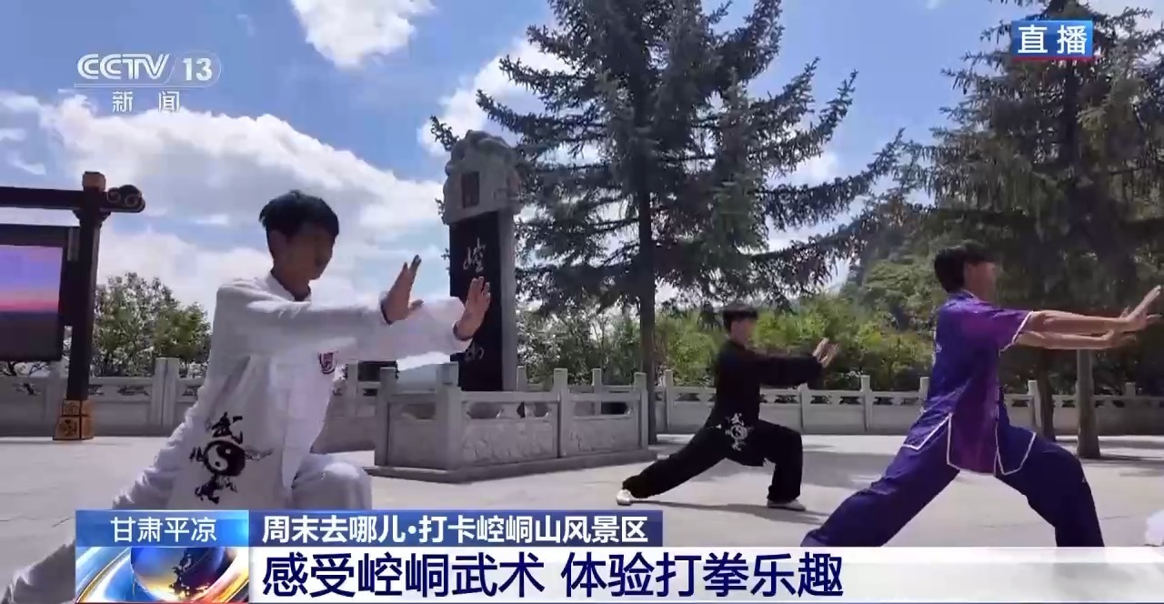 总台记者 马丽:在这里,也有不少银发游客们练习打拳,舒展筋骨。崆峒武术的传承人也会跟游客互动,教大家养生拳。崆峒山是我国五大武术流派少林、武当、峨眉、昆仑、崆峒之中,崆峒武术的发祥地。如今,这里也将崆峒武术作为展演项目定期上演。表演者们都功夫了得,他们基本上从小就开始练习。崆峒武术最讲究的就是奇兵、养生。除了日常的刀枪剑戟、斧钺钩叉,还有农具也可以用来防身。这是因为很多招式都来源于农业生产和生活当中,之后也都形成了完整的招式和套路。这些兵器方便携带,可以达到出奇制胜的效果。