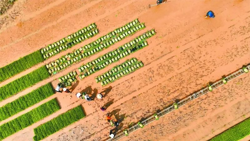 秧田里,工人们迅速地将秧苗装上插秧机。农机手技术娴熟,在他的操作下,插秧机在水田中有序行进,一排排嫩绿的秧苗被稳稳地插入泥土之中。随着插秧机的移动,原本空旷的水田渐渐被嫩绿覆盖,披上了一袭“绿装”。