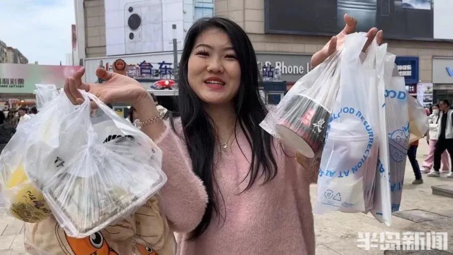 “我们并没有提前做任何攻略,就是看到什么、想吃什么,就买什么。”说着,她去买了烤鸭卷饼和卷凉皮。在恣儿街逛了一圈之后,她买到了喜欢的果茶和牛奶面包,每每拿到新的小吃,她都会拿起手机给小吃拍个特写。拍完照片后,个性率真的她直接坐在行李箱上吃了起来,边吃边评价道,“味道还挺不错的。”