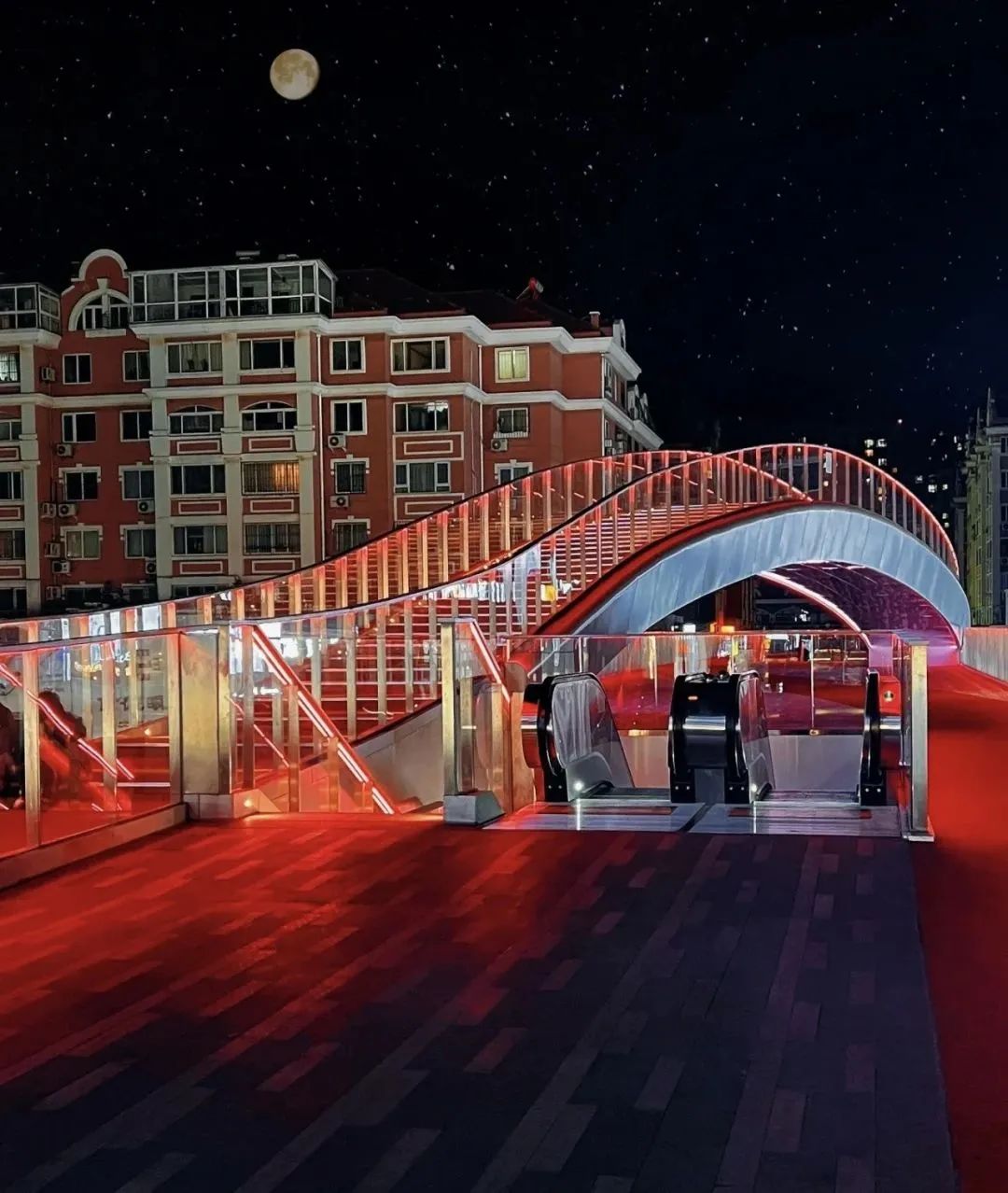 新的天桥分为上下两层,上面是拱桥,可以快速横穿威海路,下面是平段直桥,可以在此驻足观景,俯瞰整个台东商业街的全貌,看威海路的车水马龙。新天桥的整体造型非常现代化,设计感十足,拱桥与平段直桥二者共同形成一个八字形回环路径,是一座可以无限循环的漫步系统,夜晚还能亮起炫彩的灯光,站在桥上,看桥下滚滚车流,商业街璀璨繁华,别有一番风味。