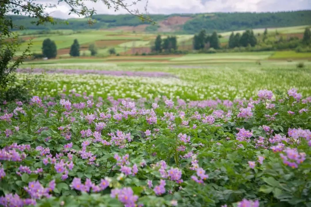 洋芋花随风摇曳,田野里处处散发着淡淡的清香。粉色、白色、紫色、蓝色,揉花碎玉般地绽放着自己一年一度的青春时光,于是呼,红的、黄的,白的,鲜花满山,好一片花的海洋。