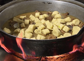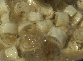 12.将和好的面擀成薄饼抹上清油,撒上葱花、面粉、盐、花椒并抹匀,卷成筒形,切成寸段,放在肉上,盖锅焖。