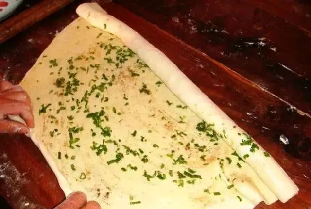 9.然后擀成大片,将前面“4”炼的羊油均匀地抺上,撒点盐。
