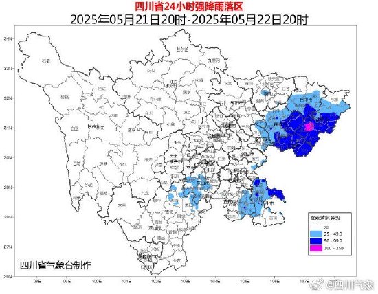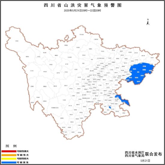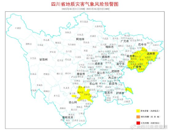 2025年5月21日20时至22日20时,泸州市泸县、合江,南充市营山、蓬安、仪陇,宜宾市长宁,广安市广安、前锋、岳池、武胜、邻水、华蓥,达州市通川、达川、宣汉、开江、大竹、渠县,巴中市平昌等19个县(市、区)可能发生山洪灾害。