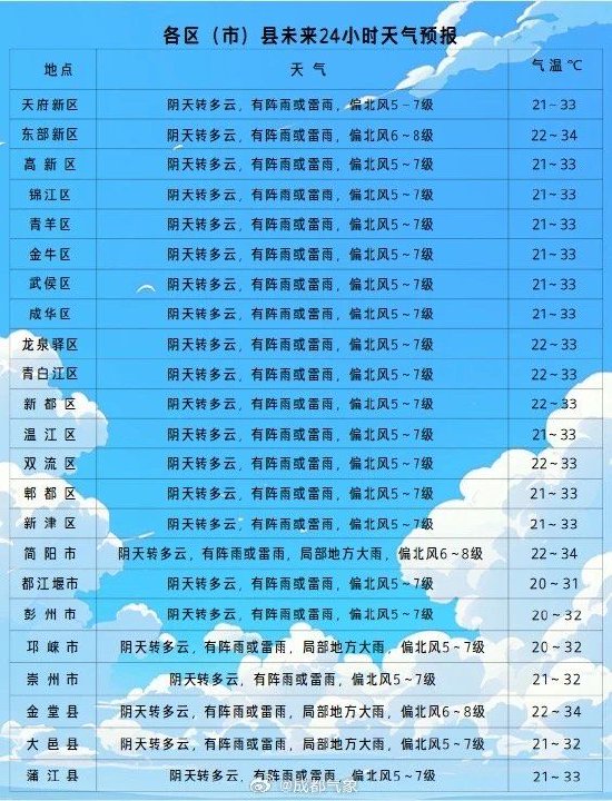 预计今天晚上到明天,成都市有阵雨或雷雨,局部地方大雨,并伴有偏北风5~7级,东部局部地方可达8级或以上,明天上午降雨逐渐停歇,天气快速转好,白天最高气温可达34℃;之后两天主要为多云间阴天气,最高气温32℃。