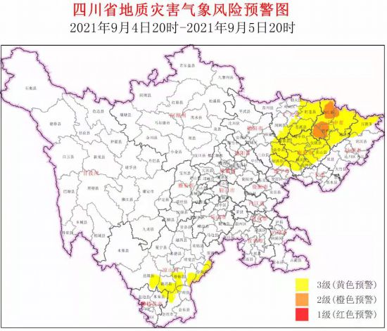 根据四川省地质环境条件,结合四川省气象台天气预报情况,9月4日20时至9月5日20时,全省地质灾害气象风险预警结果如下: