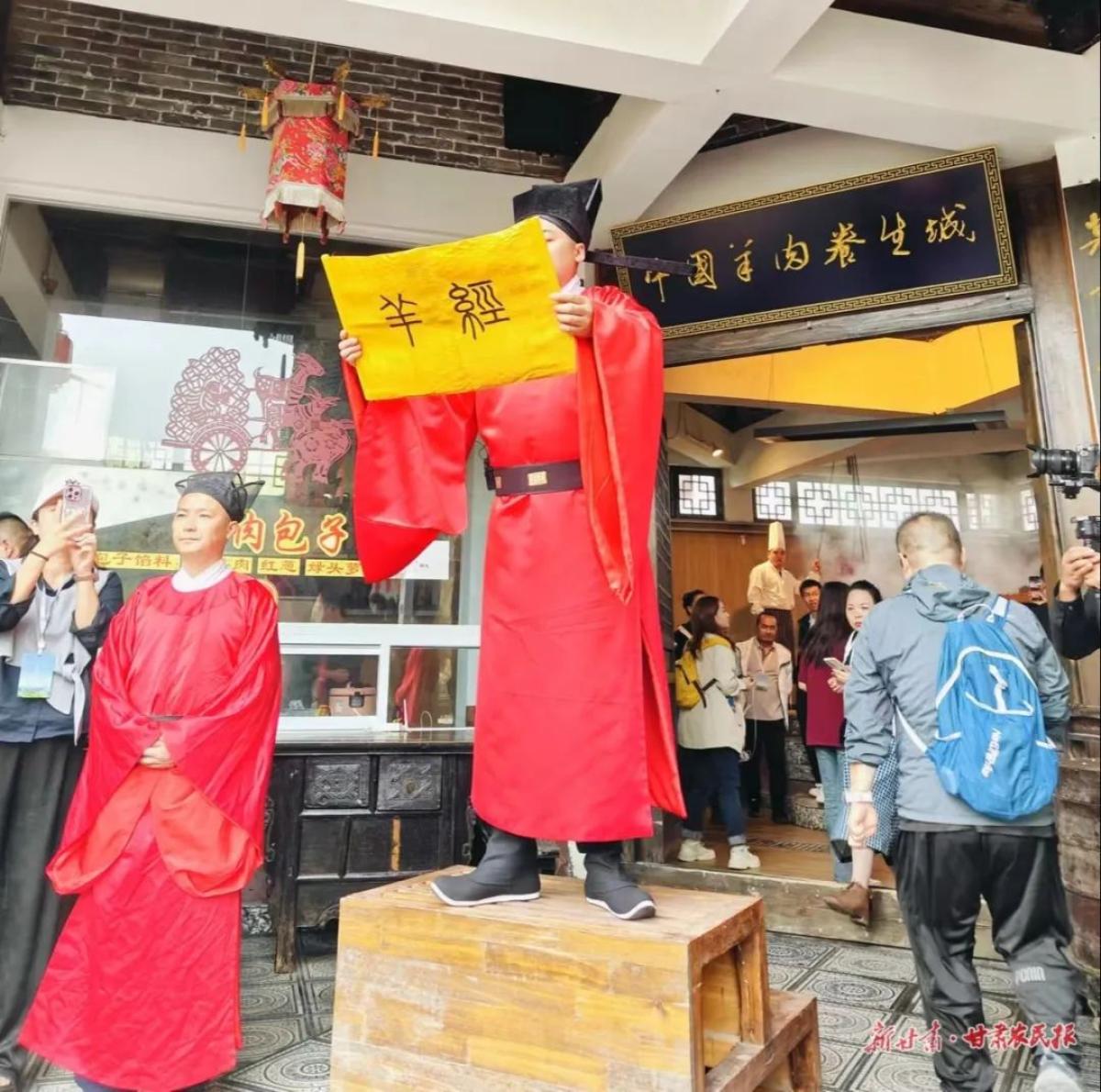 伴随范仲淹吟诵的气势恢宏的《凯旋开锅词》,“开锅”号令响起,锅盖缓缓揭开,浓郁的肉香气瞬间弥漫开来。只见大锅师傅们伸出长勺和笊篱,将肉从锅内捞起后,装盘端到游客面前,游客们围坐桌旁,品尝着美味的羊肉。