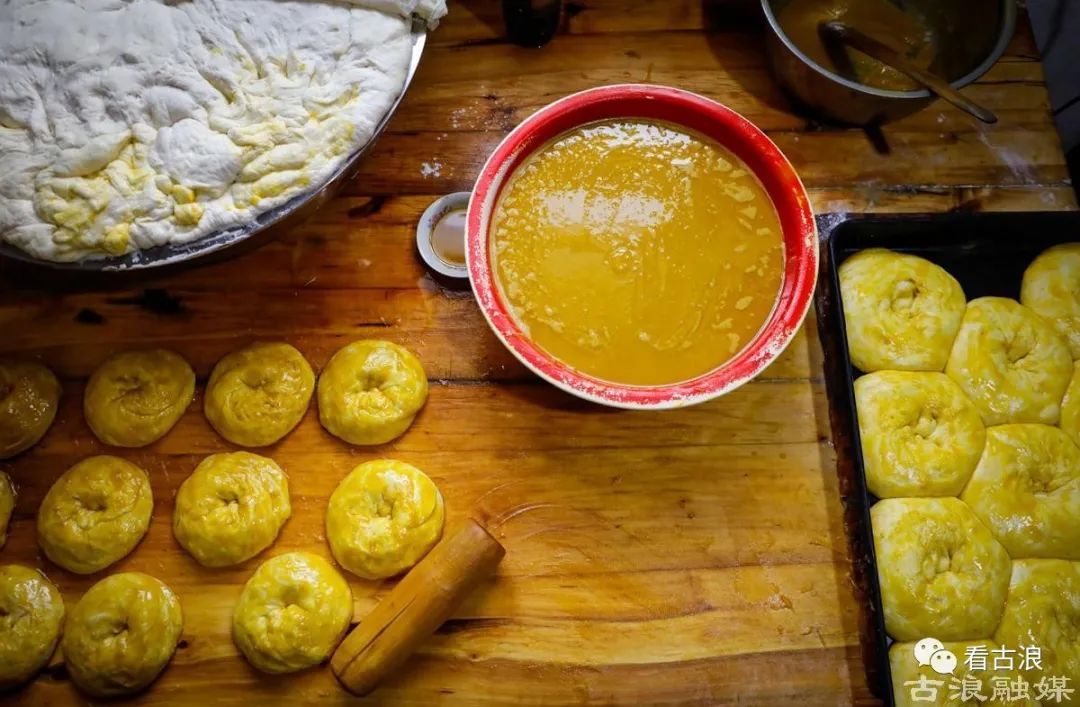 花椒水和面,撽入鸡蛋、菜籽油,纯手工发面揉的酥软,一边擀张张,一边将油姜黄层层打入卷起来,用手按压团成一个圆圆的饼,中间部分用五指压出一个小圆圈,这样防止烘烤时起泡。入炉前面饼上再次打入特制的油姜黄,然后放进电烤箱烧制,约十多分钟后饼子便烤熟了。抽出铁板在酥饼中心凹陷处撒上白砂糖,更是锦上添花、增色增香,金黄金黄的颜色,圆圆的形状很是喜庆如意。出锅后需放置一昼夜让蛋面油糖渗透相融,这样饼子更是纯真香甜,酥软味美。