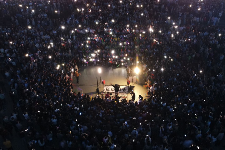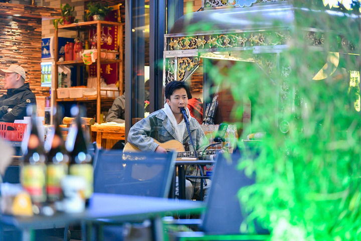 4月28日,音乐爱好者在兰州市城关区正宁路小吃夜市弹唱歌曲。新华每日电讯记者 郎兵兵 摄