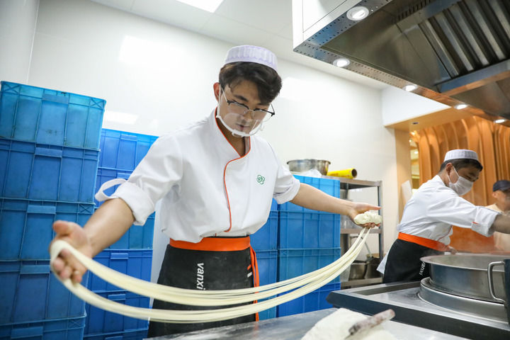 9月8日,在兰州市城关区一家牛肉面馆,师傅在拉面。新华每日电讯记者 郎兵兵 摄