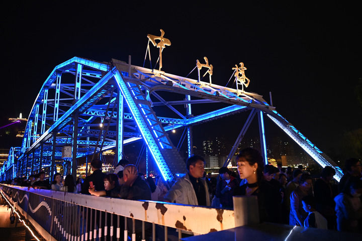 4月26日,游客在位于兰州市城关区的兰州黄河铁桥中山桥参观游览。新华每日电讯记者 范培珅 摄
