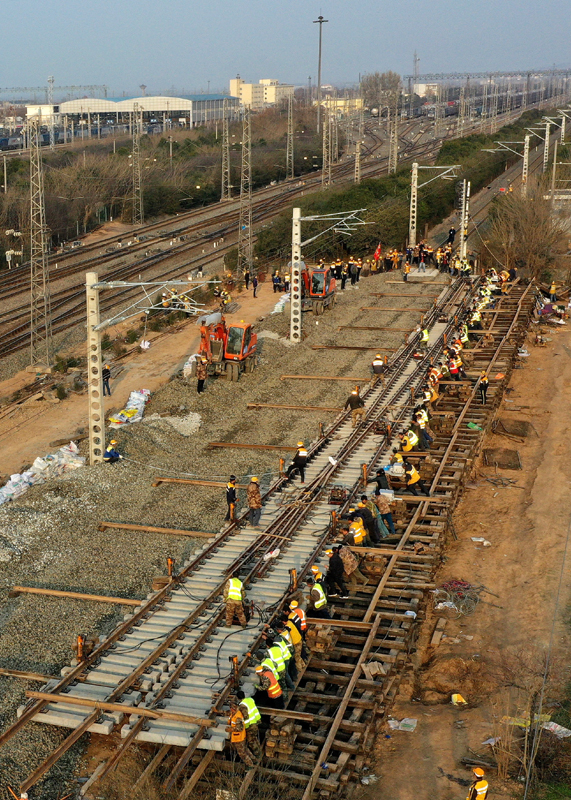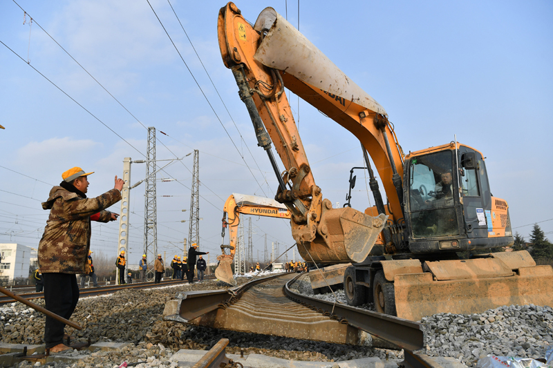 1月7日,中铁七局的铁路建设者在驳接铁路线路。