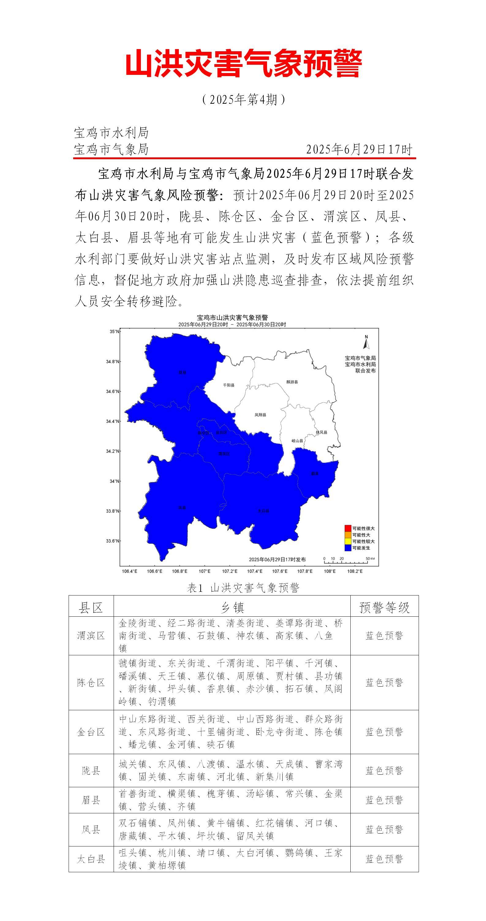 【宝鸡市气象局】宝鸡市水利局与宝鸡市气象局2025年6月29日17时联合发布山洪灾害气象风险预警:预计2025年06月29日20时至2025年06月30日20时,陇县、陈仓区、金台区、渭滨区、凤县、太白县、眉县等地有可能发生山洪灾害(蓝色预警);各级水利部门要做好山洪灾害站点监测,及时发布区域风险预警信息,督促地方政府加强山洪隐患巡查排查,依法提前组织人员安全转移避险。