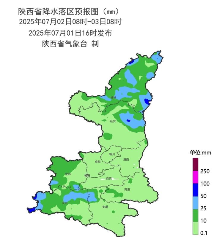 7月2日:全省大部有小雨(0.1~10毫米),陕北部分、关中西部、陕南西部、秦巴山区有中雨(10~25毫米),其中宝鸡南部、汉中西部及北部、安康北部有大雨(25~45毫米),榆林北部及东部(神木、绥德、吴堡)、延安东部(延长)、汉中西部(宁强、略阳)有暴雨(50~70毫米)。降水期间陕北、陕南局地伴有短时暴雨、雷暴大风等强对流天气。