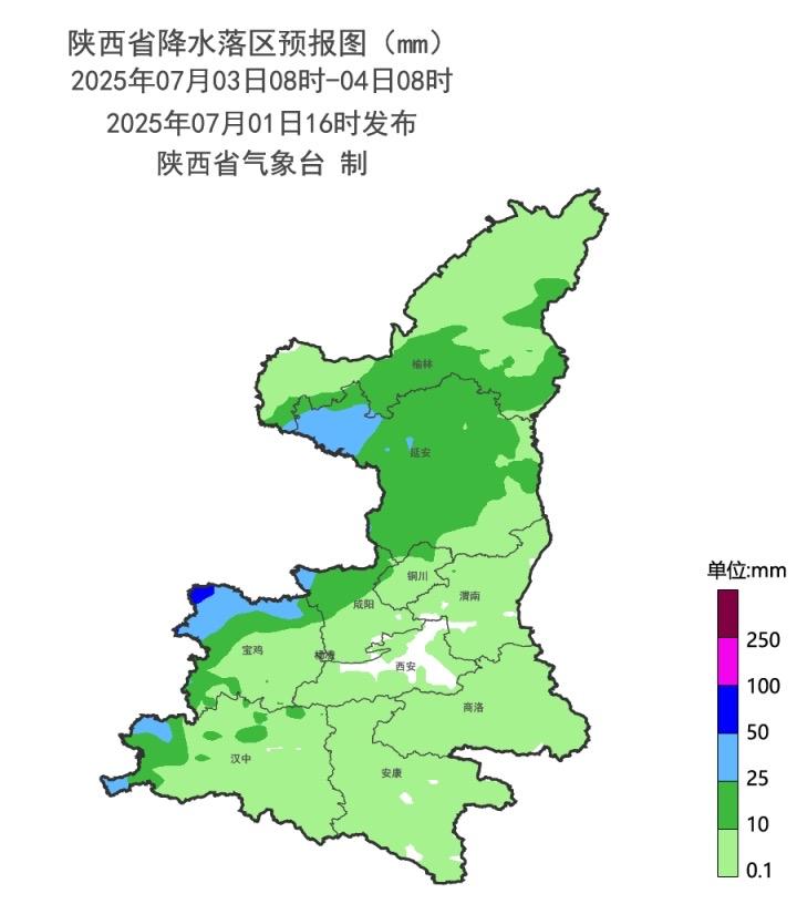 7月3日:全省有小雨(0.1~10毫米),陕北大部、关中西部及北部、陕南西部有中雨(10~25毫米),其中延安西北部、宝鸡北部、汉中西部有大雨(25~40毫米),宝鸡西北部(陇县)有暴雨(50~70毫米)。降水期间局地伴有短时暴雨、雷暴大风或冰雹等强对流天气。