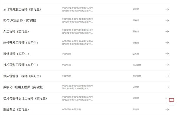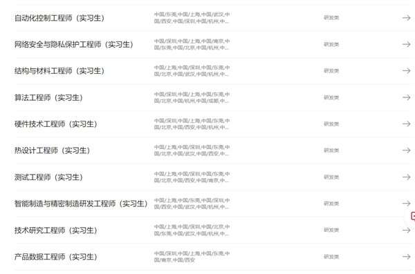 根据官网显示,目前正在招聘实习生的岗位有自动化控制工程师、网络安全与隐私保护工程师、结构与材料工程师、热设计工程师、AI工程师、涉外律师、技术采购工程师、财经专员等。