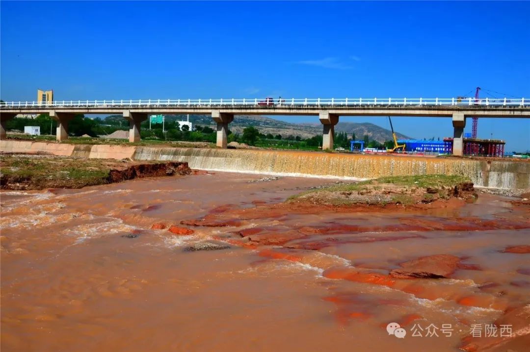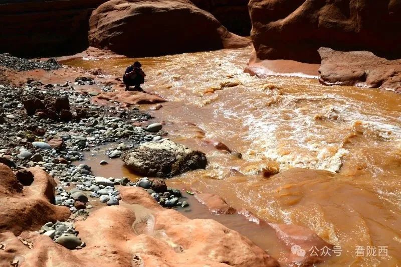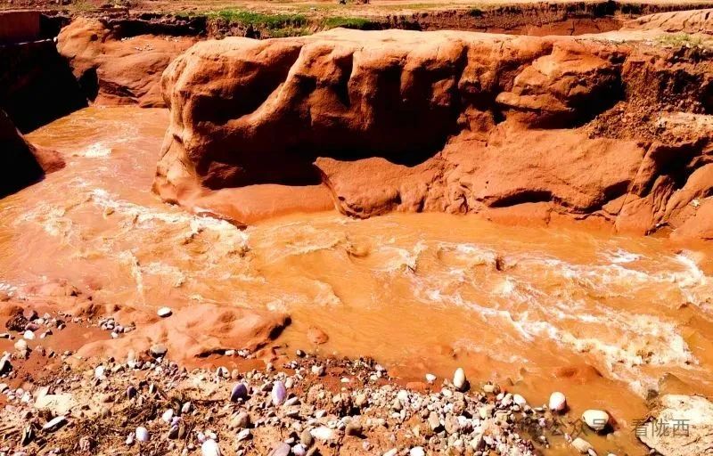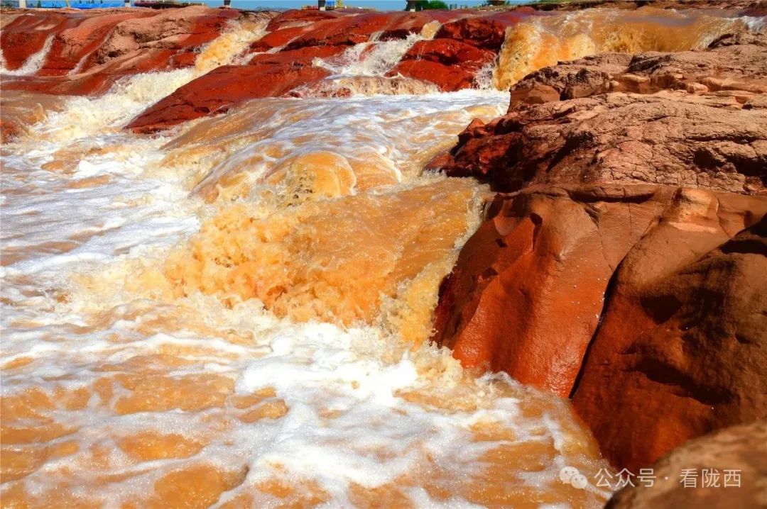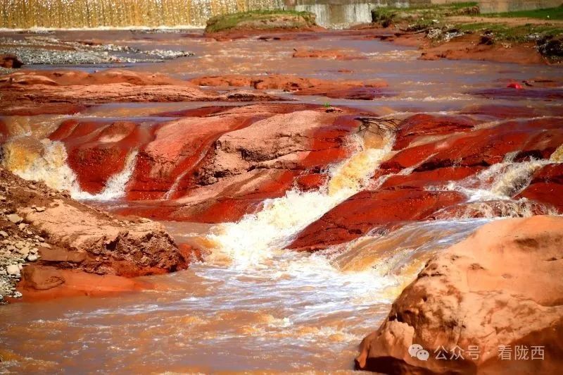 夏日的渭河河那坡段,红色砂岩在流水的雕琢下形成了层叠的滩涂,河水奔腾而下,溅起朵朵白色浪花。这幅既显雄浑又富斑斓的独特景观,吸引了众多市民前来游玩、打卡。