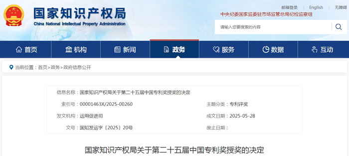 国家知识产权局关于第二十五届中国专利奖授奖的决定