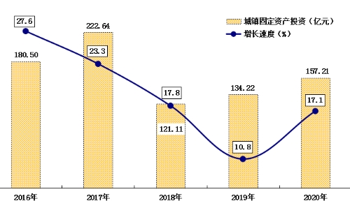 全年完成全社会固定资产投资157.72亿元,同比增长13.7%。其中城镇固定资产投资157.21亿元,同比增长17.1%;农村固定资产投资0.51亿元,同比下降88.7%。民间固定资产投资57.03亿元,同比增长28.7%。