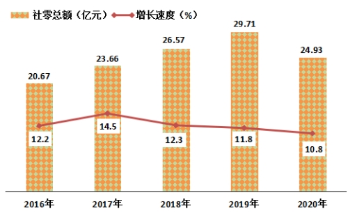 按销售单位所在地分,城镇消费品零售额23.16亿元,增长10.7%;乡村消费品零售额1.77亿元,增长3.4%。按行业分,批发业实现零售额3.52亿元,增长4.6%;零售业实现零售额17.68亿元,增长10.4%;住宿业实现零售额0.41亿元,增长11.2%;餐饮业实现零售额3.32亿元,增长14.6%。