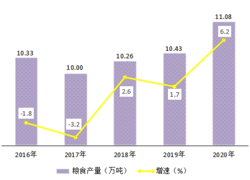 全年粮食作物播种面积49.66万亩,比上年增长1.2%。粮食总产量11.08万吨,比上年增长6.2%。其中小麦播种面积25.56万亩,总产量4.21万吨,分别较上年增长2.9%和9.1%;玉米播种面积18.19万亩,下降0.3%,总产量6.04万吨,增长4.7%。