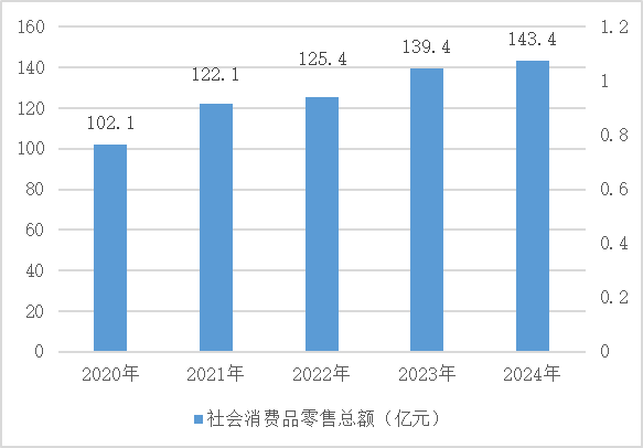 全年实现社会消费品零售总额143.4亿元,比上年增长2.8%。其中,限额以上企业(单位)消费品零售总额28.2亿元,增长22.2%。按经营地分,城镇消费品零售额101.7亿元,比上年增长3.0%;乡村消费品零售额41.7亿元,增长2.5%。按消费类型分,商品零售额113.9亿元,增长3.0%;餐饮收入29.4亿元,增长2.2%。