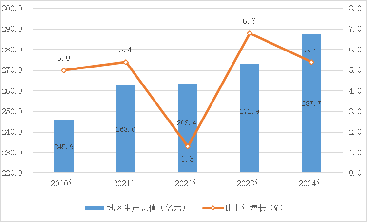 图1 2020-2024年仪陇县地区生产总值总量及增速