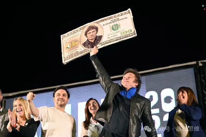 自称“无政府资本主义者”的米莱在去年11月的一次竞选活动中,举起一张带有他肖像的巨型美元钞票