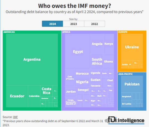 截止2024年4月2日,IMF欠债最多的几个国家,阿根廷位居榜首