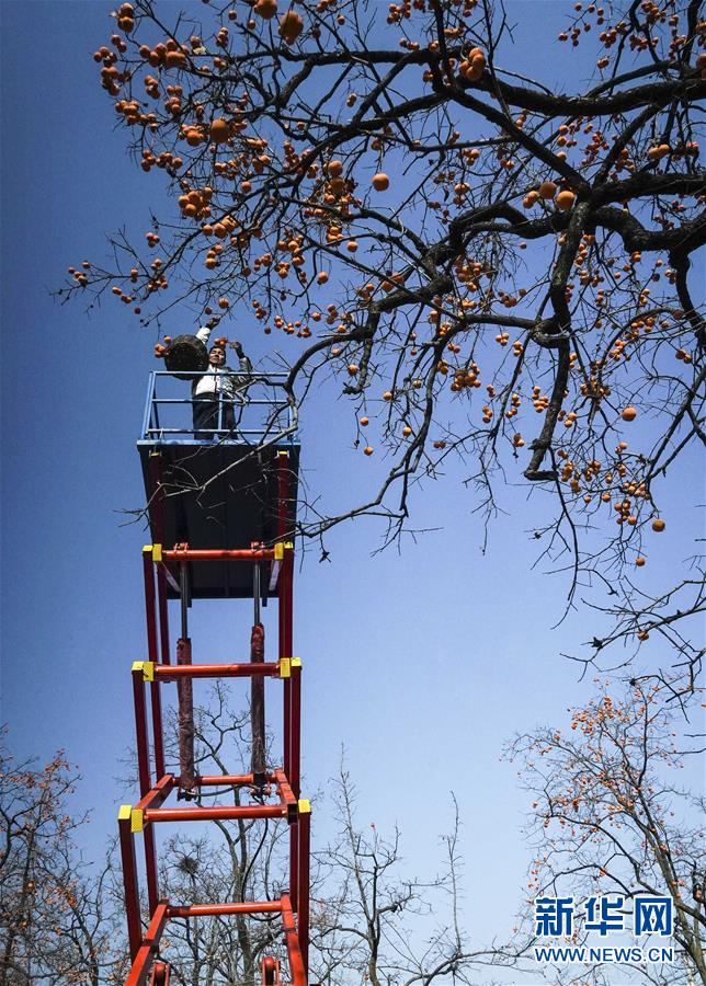 11月14日,陇县天成镇范家营村金秋果品专业合作社的工作人员在升降车上摘柿子。