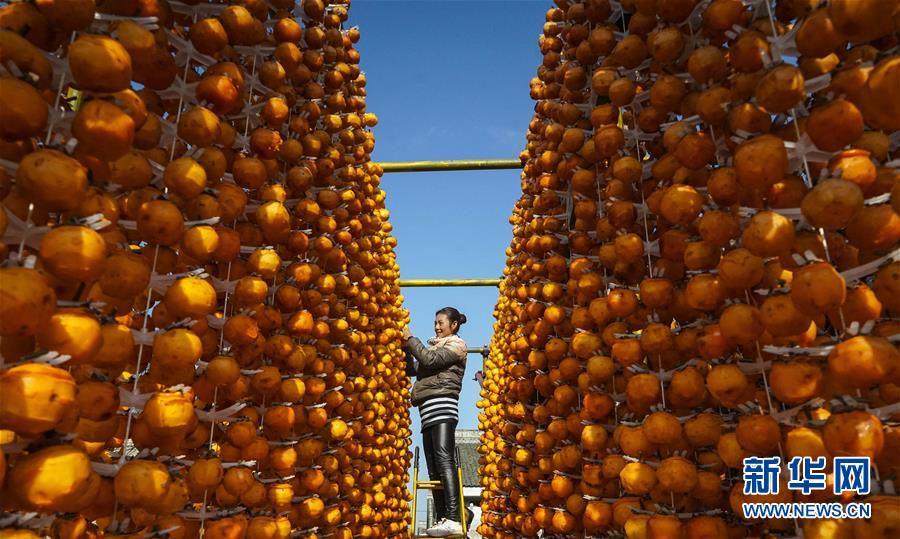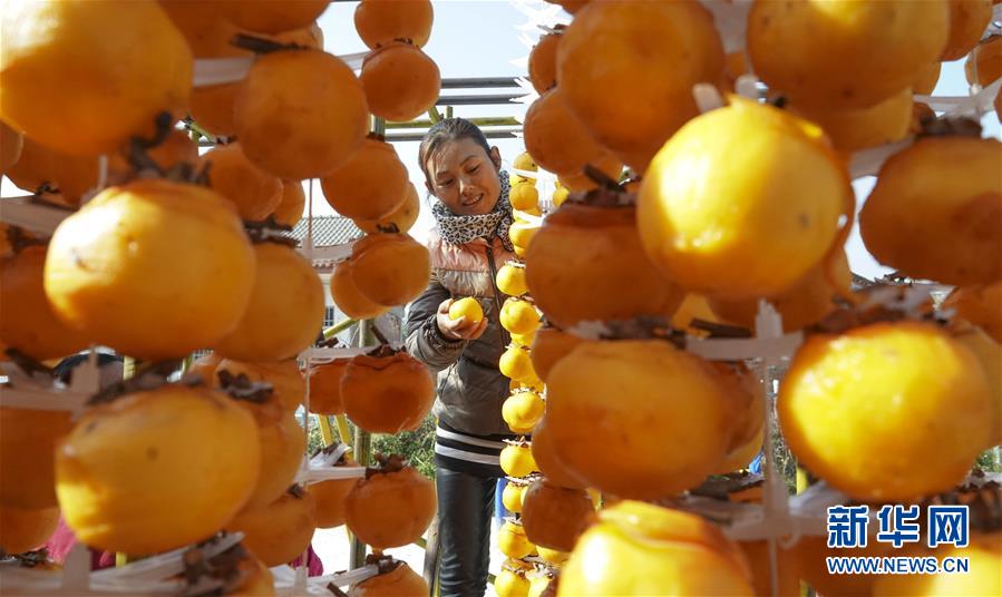 11月14日,陇县天成镇范家营村金秋果品专业合作社的工作人员在晾晒柿子。