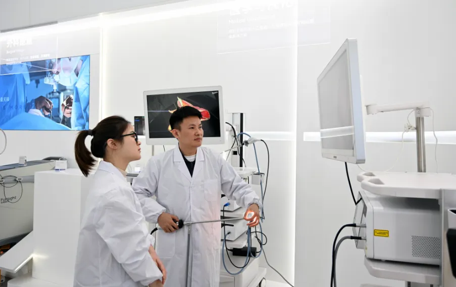 华东数字医学工程研究院工作人员示范操作4K超高清荧光内窥镜摄像系统。戴越/摄